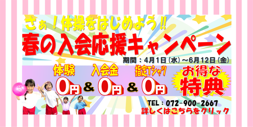 こんにちは、ピプス体操クラブです!本日は入会キャンペーン情報です!! 今年もやってきた、新たなことにチャレンジすることが多いこの季節!今年は習い事を何か始めたい!!そんなあなたにお得な情報☆ピプス体操クラブでは春の入会応 […] -